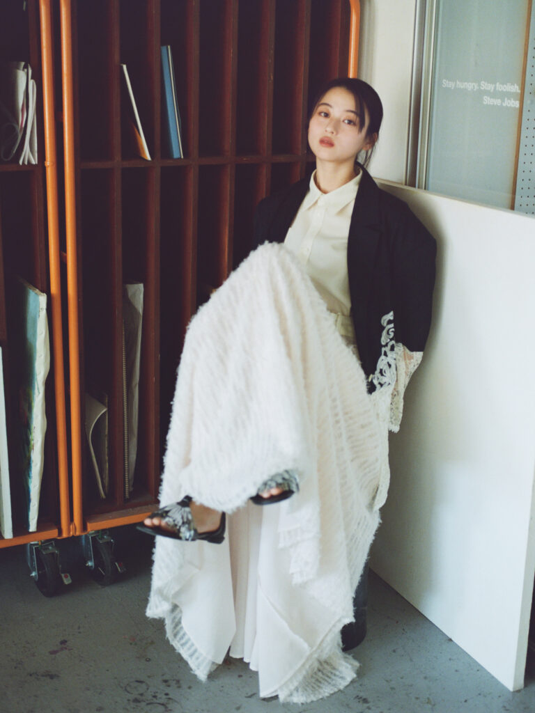 ジャケット¥79,200/フミエタナカ(ドール)、中に着たドレス¥107,800/タケマル、シューズ¥37,400/シーセイ