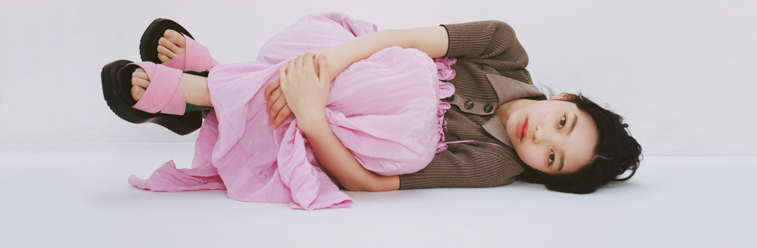 ジャケット¥147,000、ドレス¥64,900、中に着たニット¥68,200*以上全て参考価格/ガニー、シューズ¥10,500/チャールズ&キース(チャールズ&キース ジャパン)