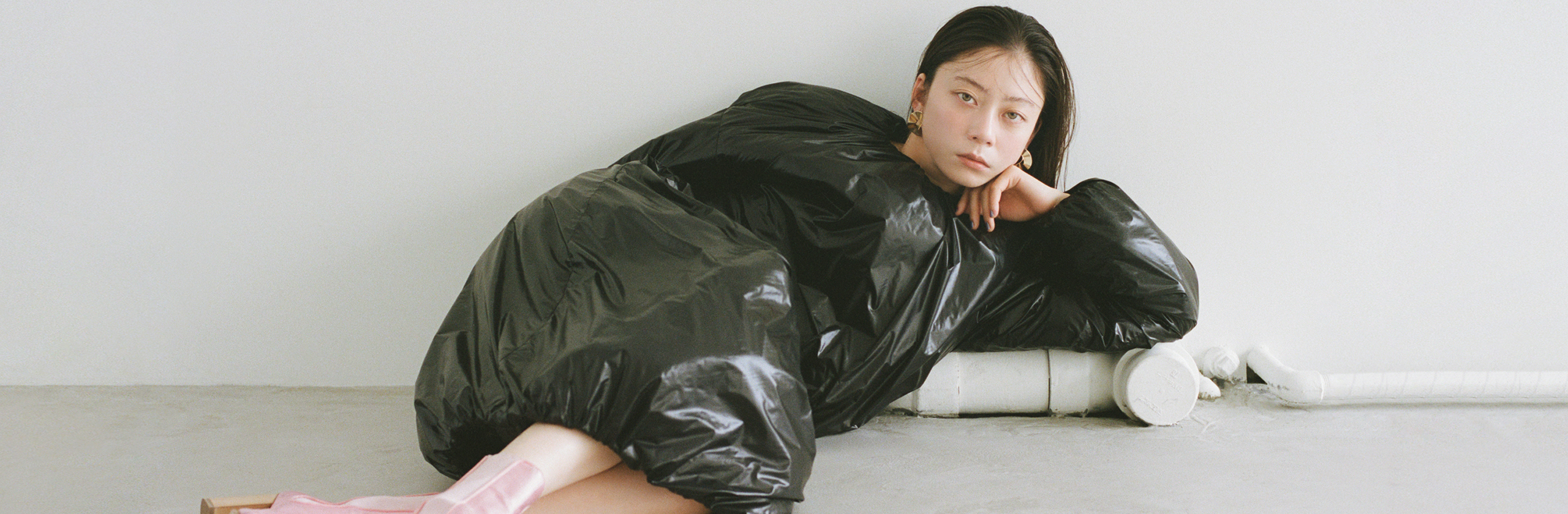 ドレス¥159,500/マリーン・セル、ピアス¥19,800/ユェチ・チ(ともにMATT.)、シューズ¥36,300/ミキオサカベ